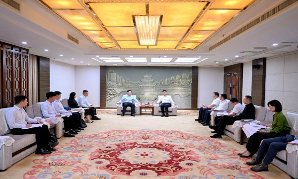8月21日,市委副书记、市长王宏在筑会见中欧注册_中欧(中国)有限公司党委书记、董事长陈先瑞一行,双方就深化务实合作进行交流。
