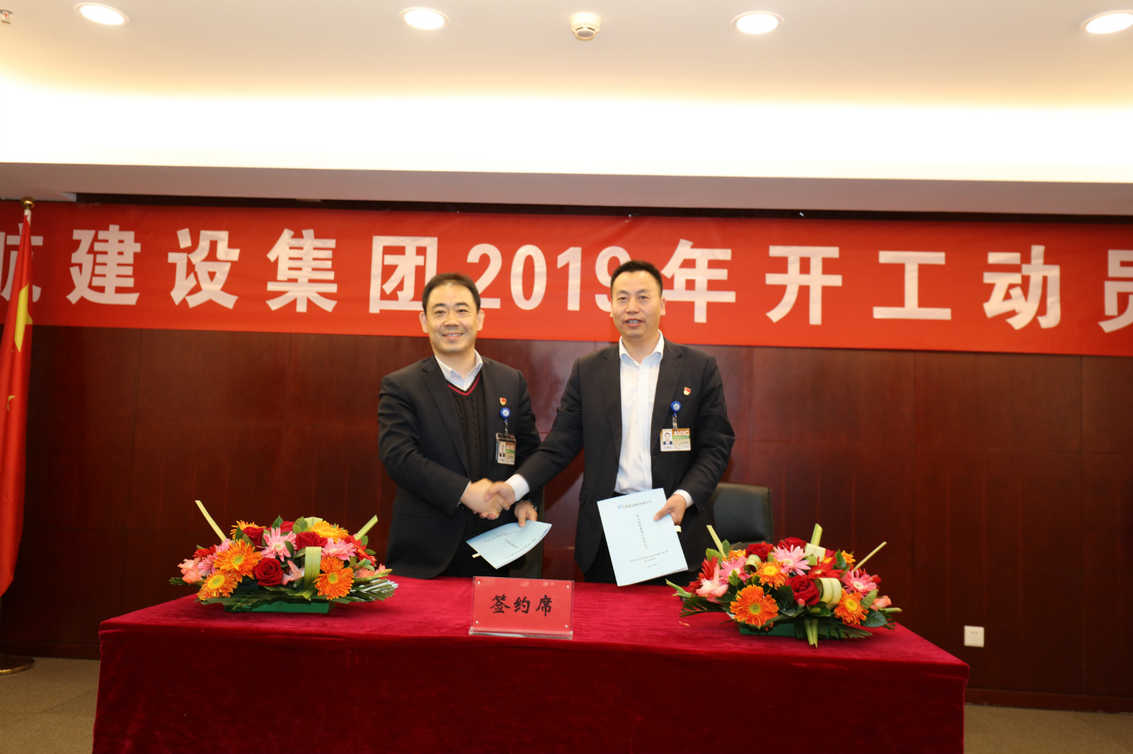 9时整,大会在雄壮的国歌声中开始。集团公司总经理王建红作了开工动员并下达了年度经营任务;生产副总经理王利下达了年度施工生产任务;总工程师陈劲下达了年度技术质量和科技创新任务。京内外各项目部签领了年度经营、生产、技术质量和科技创新任务书。